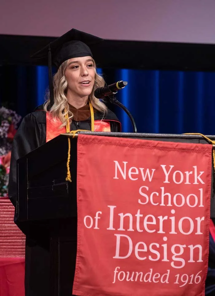 NYSID allows its graduating students to vote to determine who will speak on their behalf at commencement. This year, the undergraduates selected Paulina Castillon Gomez, ‘23 (BFA). Castillon Gomez has served as the president of NYSID’s Undergraduate Student Association and was part of the NYSID team for HousingWorks’ Design on a Dime benefit. “Strive to show up as your authentic selves every single day,” she said. “Your work as an interior designer is not only about acquired knowledge, but also about how you connect and create for the people around you.”