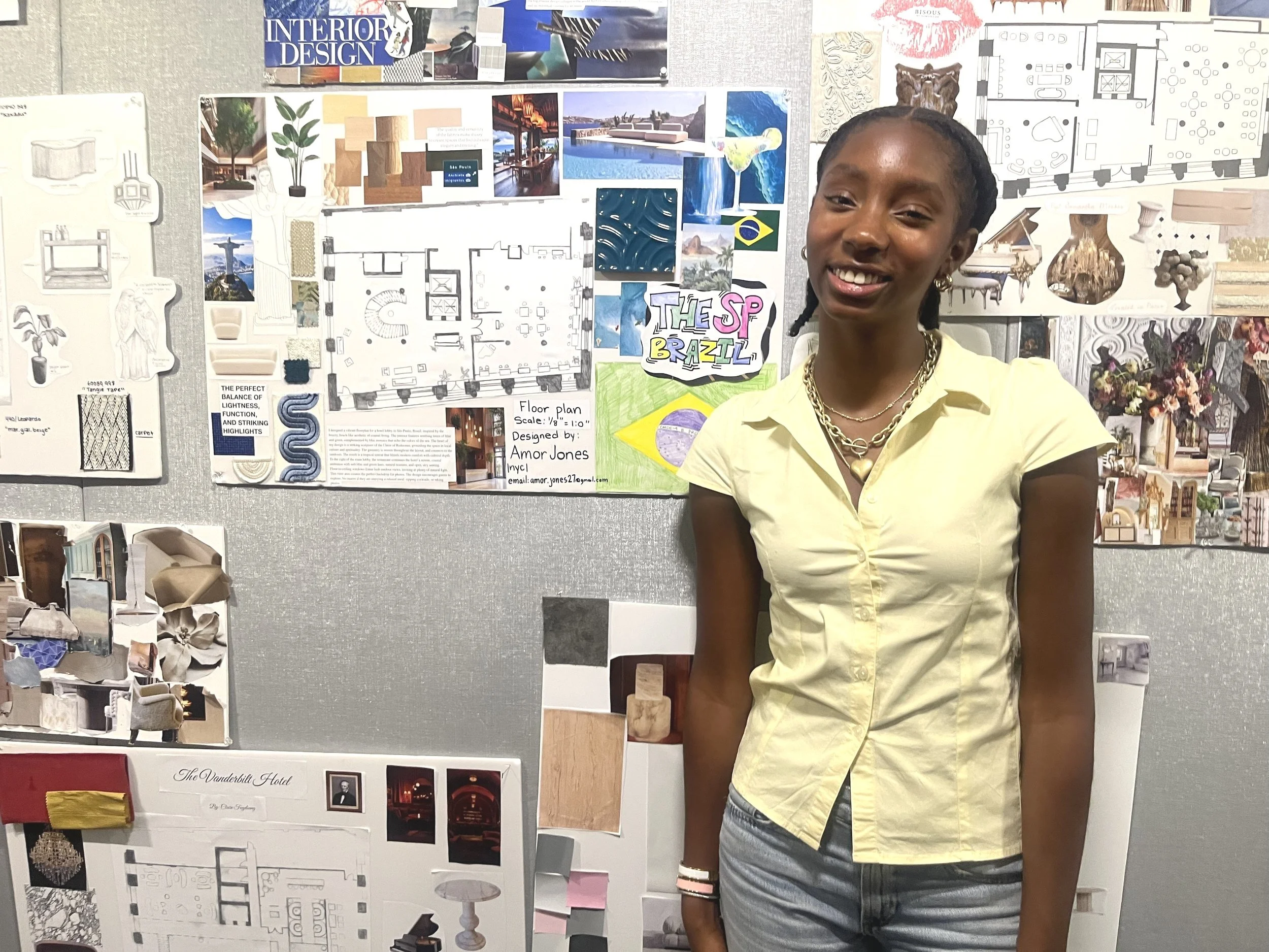 Amor Jones, a rising junior from New Jersey who attended Pre-College I last summer, returned to take Pre-College II, thanks to a scholarship from The Decorator’s Club. Pre-College II focuses on commercial design, specifically the design of a hotel lobby or restaurant. Amor’s project was “The SP Brazil,” a hotel and restaurant set in São Paulo. Her color choices echo the blues and greens of the sea. The heart of her project is a striking sculpture of Christ the Redeemer, which grounds her design in the cultural and spiritual life of the city. She designed a graffiti-style logo in which she set the colors of the Brazilian flag against electric pink. Amor says, “The big difference this year is that I came in knowing the basics, so I was able to step out of my comfort zone and really make it about the culture and colors of São Paulo.” Asked what she plans to do in the future, Amor said, “This program helped me develop my interest in something I love. I think I am going to go to school for an undergraduate degree in business, centered on real estate, and then pursue a graduate degree in interior design.”