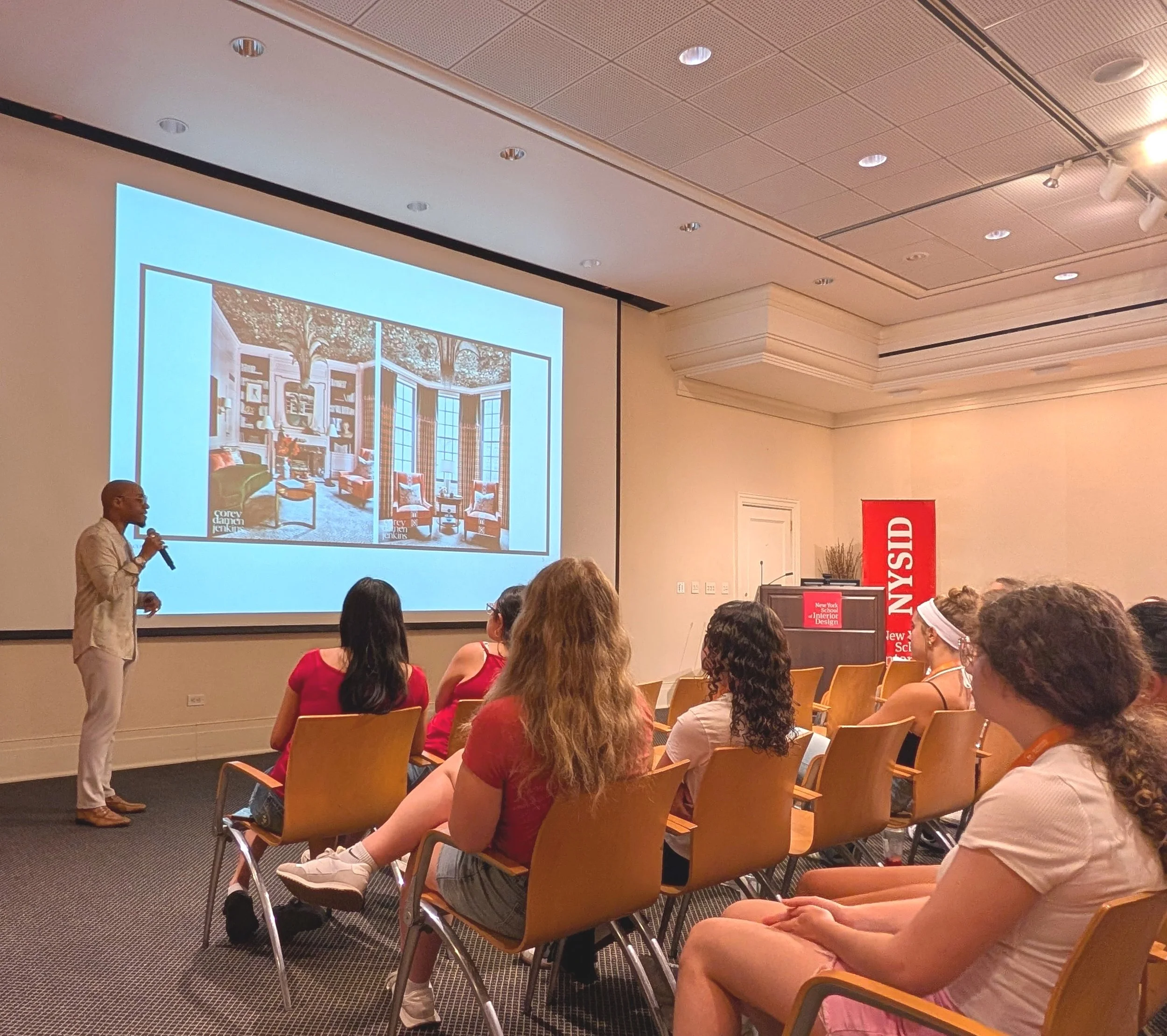 On July 16, NYSID Pre-College students listened intently as AD100 designer Corey Damen Jenkins shared his journey, from early discouragement and rejection to career success. His father did not regard interior design as a “real career” and refused to pay for a degree in the discipline. Despite his father's refusal, Damen Jenkins moved to Brooklyn at age 19 and landed a design internship. There, he tried and failed to support himself, so he moved back home to Michigan, studied business, and spent a decade working as a purchasing agent in the auto industry. Damen Jenkins finally took another stab at a design career in 2008, during the Great Recession, in Michigan, a place where there were no other designers he knew of who looked like him. He struggled to find his first client for months. He set a goal to knock on the doors of 1,000 homes that were under construction to offer his services. He knocked on 778 doors. Many were slammed in his face. In one case, he was chased away by dogs. At the 779th door, a couple invited him in for coffee and scones and allowed him to show his portfolio. He ultimately designed their living and dining rooms. The photos of this project on his website attracted casting executives from HGTV’s “Showhouse Showdown,” a televised design contest he eventually won. It was the break that established his reputation.