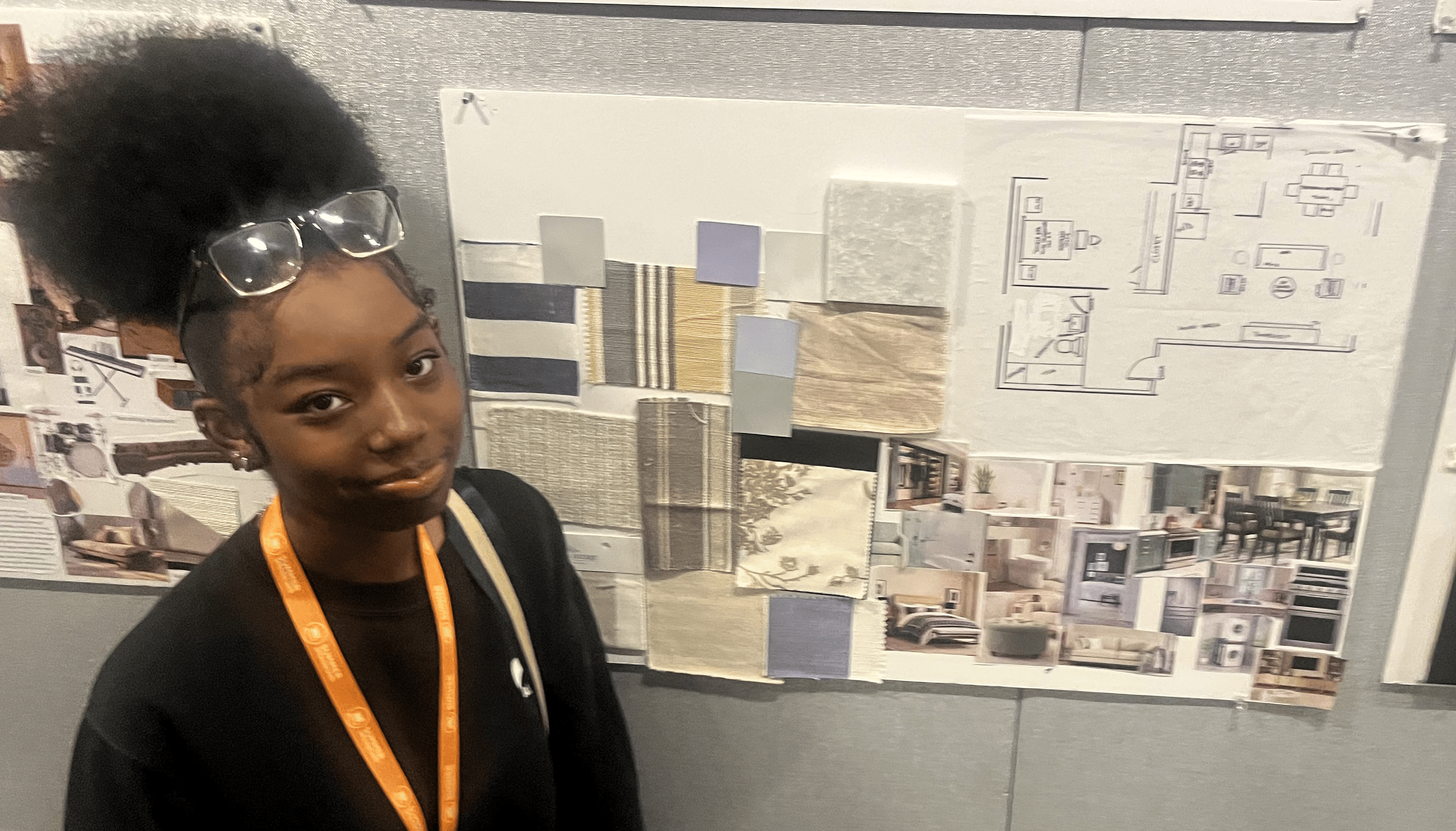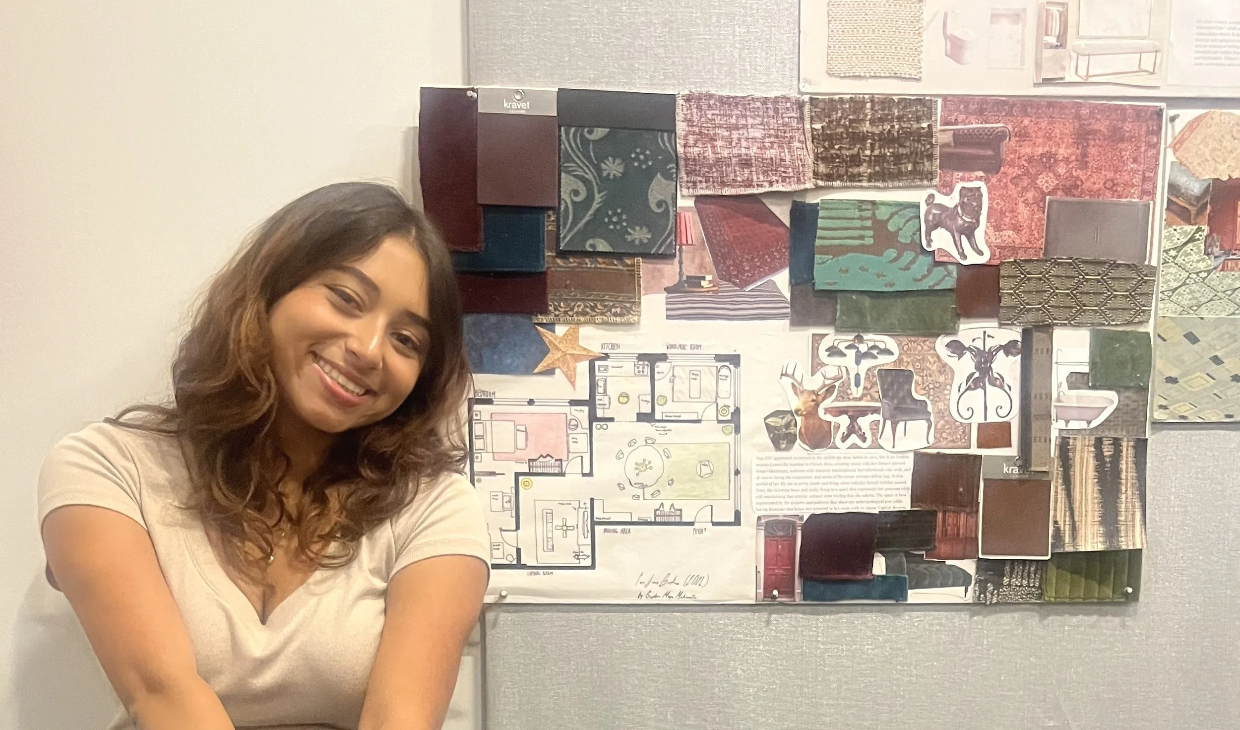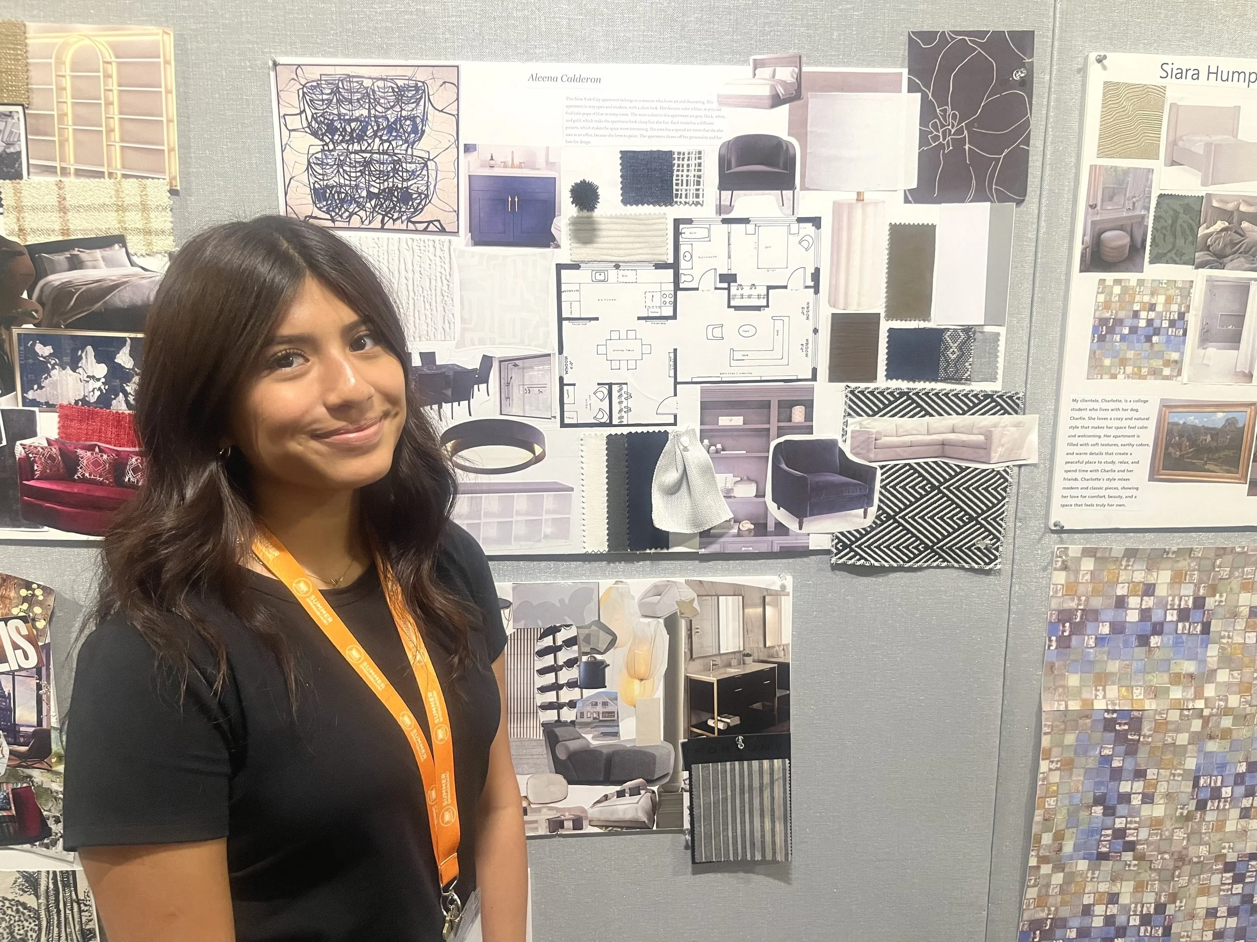 Layla Barbee, a Pre-College I student and recipient of a scholarship from the Estate of Joseph Grusczak, is from California. She created a project so eye-catching that NYSID’s Dean and VP for Academic Affairs Ellen Fisher, stopped beside it and asked Layla to present. The apartment was for a college student in New York City, and Layla used a daring color palette of greens, pinks, corals, and golds. She says, “The most useful takeaways from this course were learning how to scale and the introduction to color.” Pointing to her floor plan, she said, “I learned important details about drafting, such as you have to make the lines thicker for plumbing walls, and how to work around a structural problem, like this column. I extended it into a countertop.”