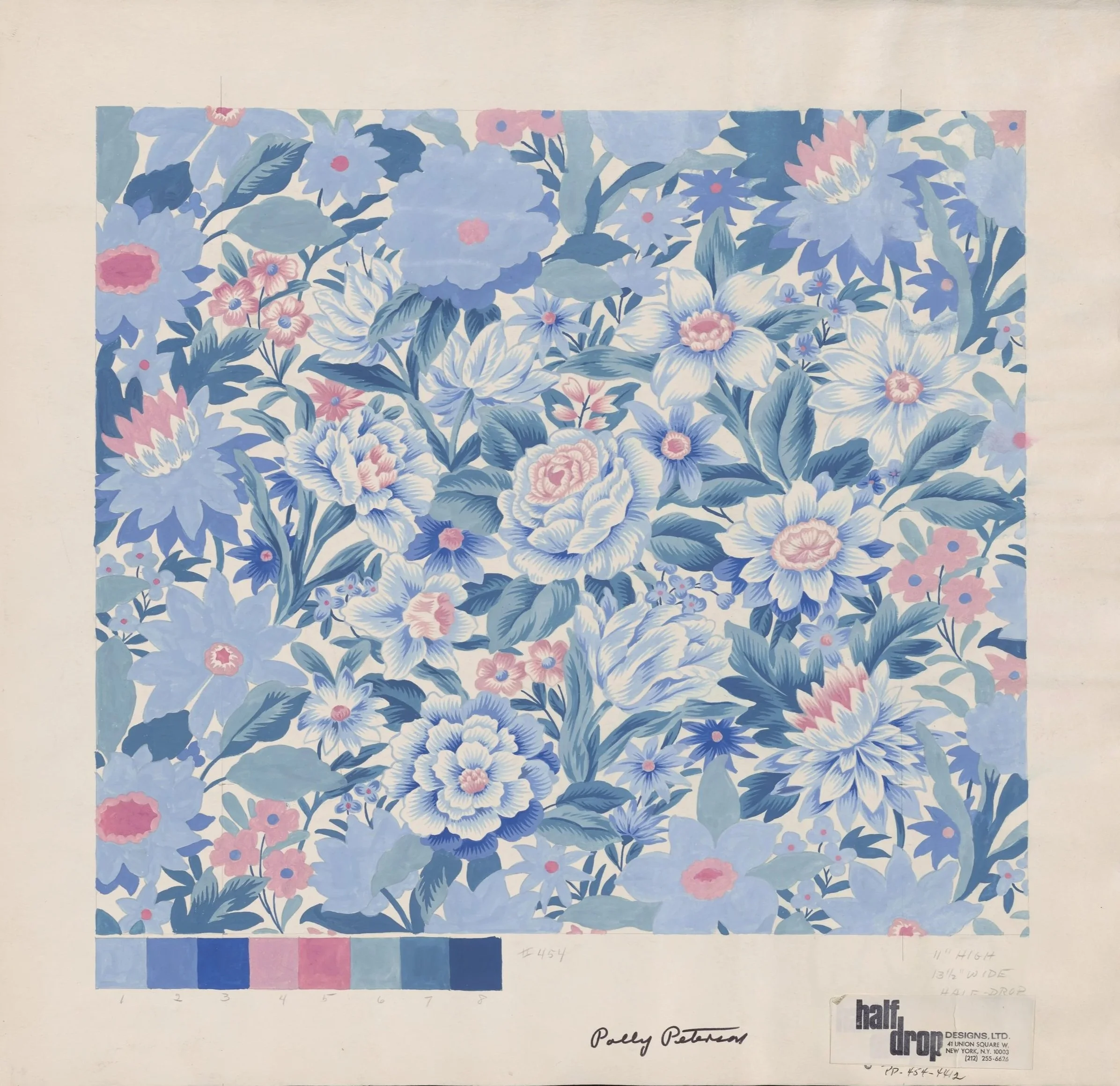 Blue Floral for Half Drop Designs, Polly Peterson, ca.1970s-90s Gouache on paper